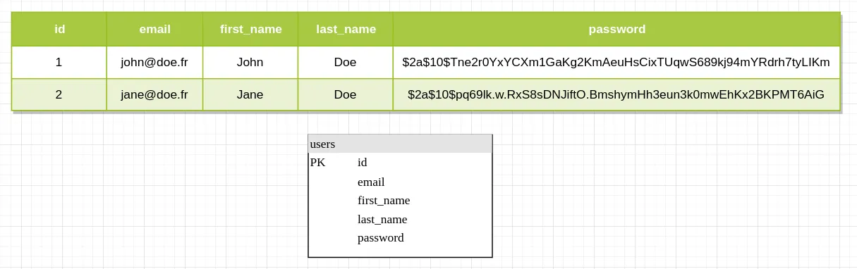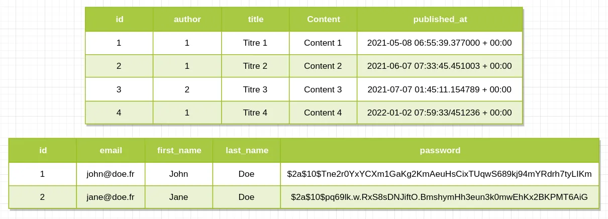 Si l'on prend l'exemple ci-dessus, on voit que dans la table users (celle du bas) il y a deux utilisateurs enregistrés et dans la table articles (celle du haut) il y a quatre entrées, donc quatre articles. Chaque ligne des deux tables a un numéro d'identifiant qui est unique (colonne id). Pour ce qui est de la liaison, si l'on regarde la colonne author dans la table du haut, on voit que les articles 1, 2 et 4 sont écrits par John Doe (identifiant 1) et que l'article 3 a été écrit par Jane Doe (identifiant 2).