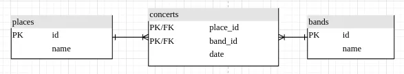 Dans l'exemple ci-dessus, on a la clé composite qui correspond aux colonnes band_id et place_id, ces deux colonnes forment une clé primaire composite, mais chacune de ces colonnes est également une clé étrangère, qui pointe chacune vers une autre table.
