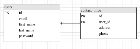 Une relation one-to-one correspond à une relation où une entrée de la table 1 ne peut être liée qu'à une seule entrée de la table 2 et une entrée de la table 2 ne peut être liée qu'à une seule entrée de la table 1. Exemple :